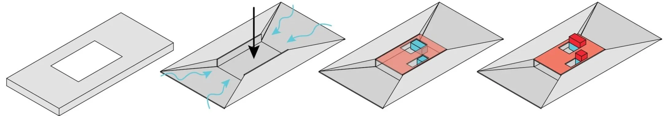A microclimate is created between the fabric and the skin. Using sweat turned into vapor to cool the air around the body.As summers can reach 36 degrees and winters can drop to -2 degrees, it is important to provide areas to escape the heat and areas to shelter from the summer sun. To do this, the initial mass was placed underground with winter gardens placed above to create a temperature threshold.