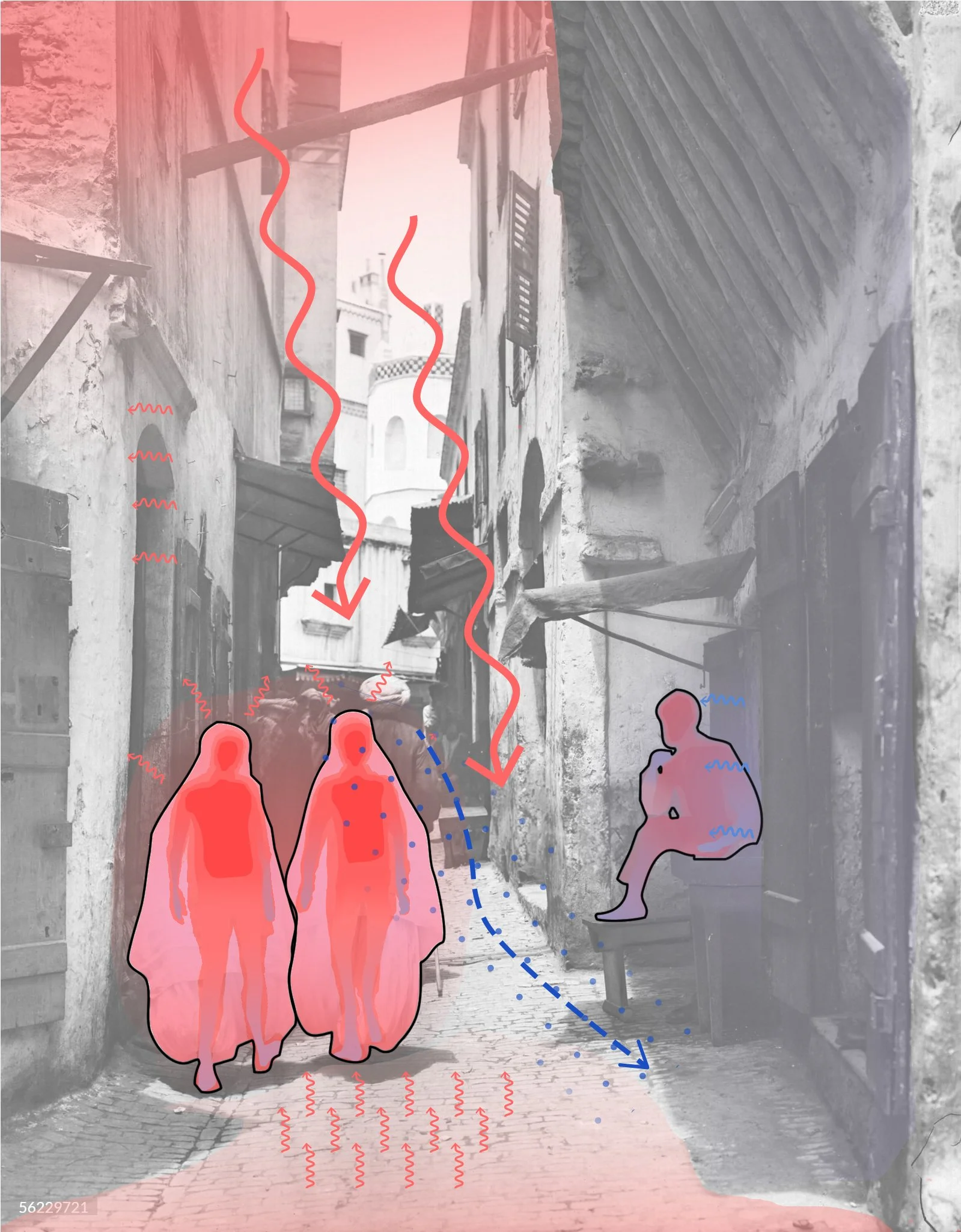 The human architecture for this project was just as important as the general climate analysis. Specifically, the architecture of common clothing in Algiers, Algeria. Because of their common garment, the temperature outside could be 40 degrees Celsius, while the temperature inside the clothes is below 30 degrees Celsius. This understanding of the human architecture made us wonder how that structure reacts to the common tectonic architecture in Algiers.